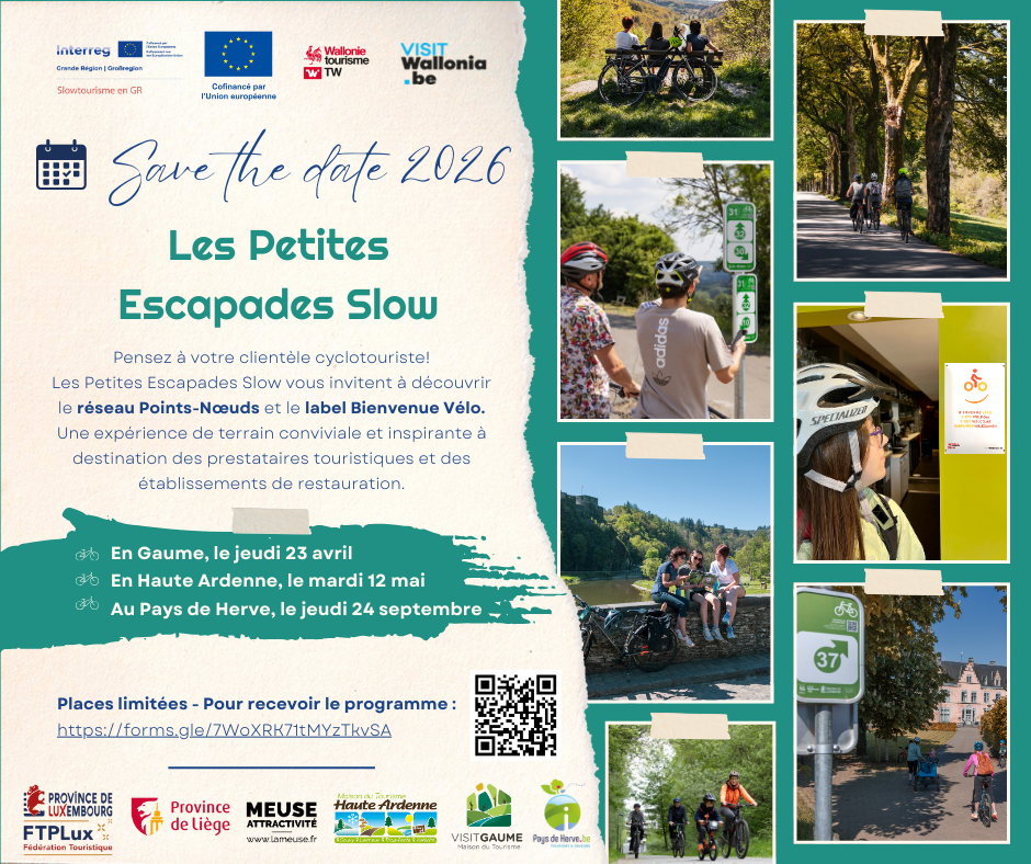 Dans le cadre du projet Interreg Slowtourisme en Grande Région, la Fédération touristique de la Province de Luxembourg, TourismePro - Province de Liège et Meuse Attractivité invitent les opérateurs touristiques et établissements horeca à une immersion conviviale autour du cyclotourisme
